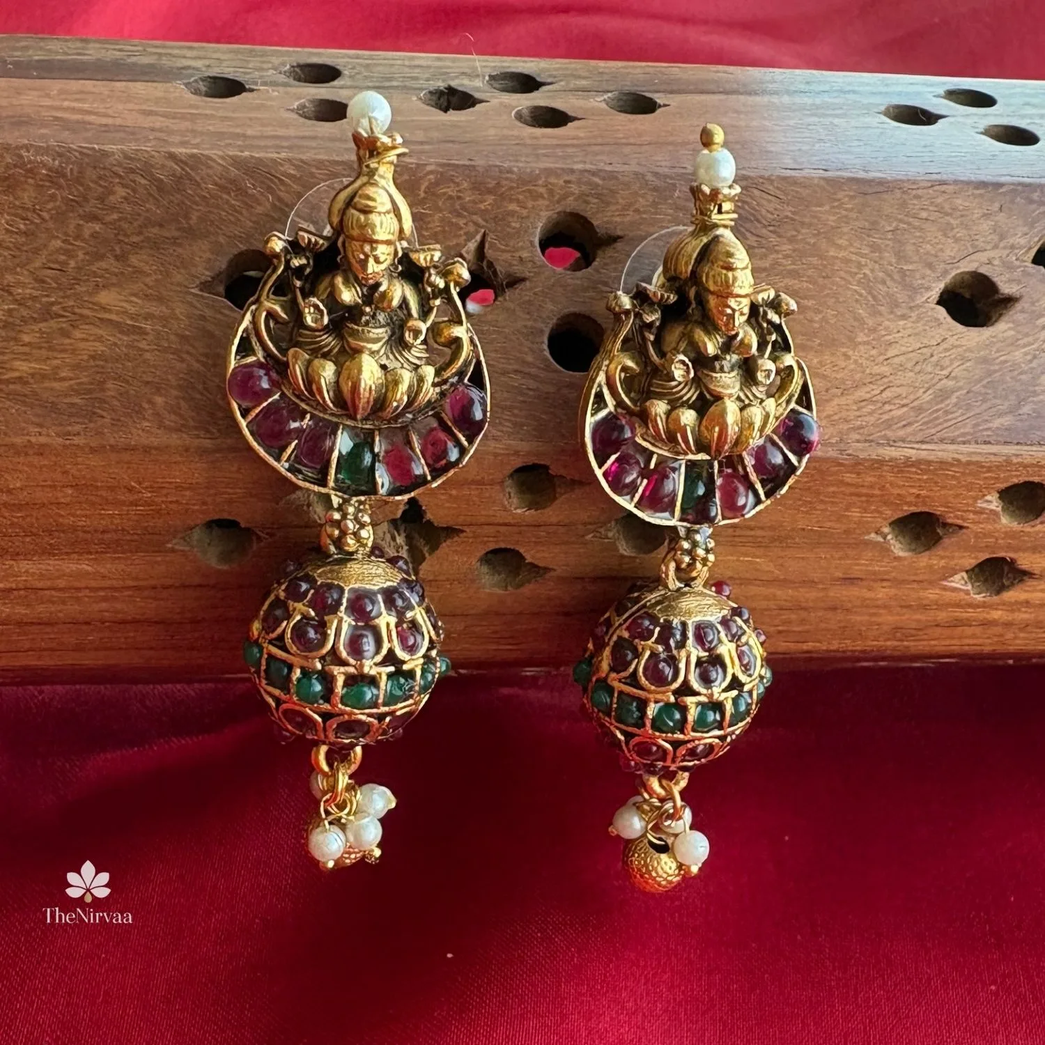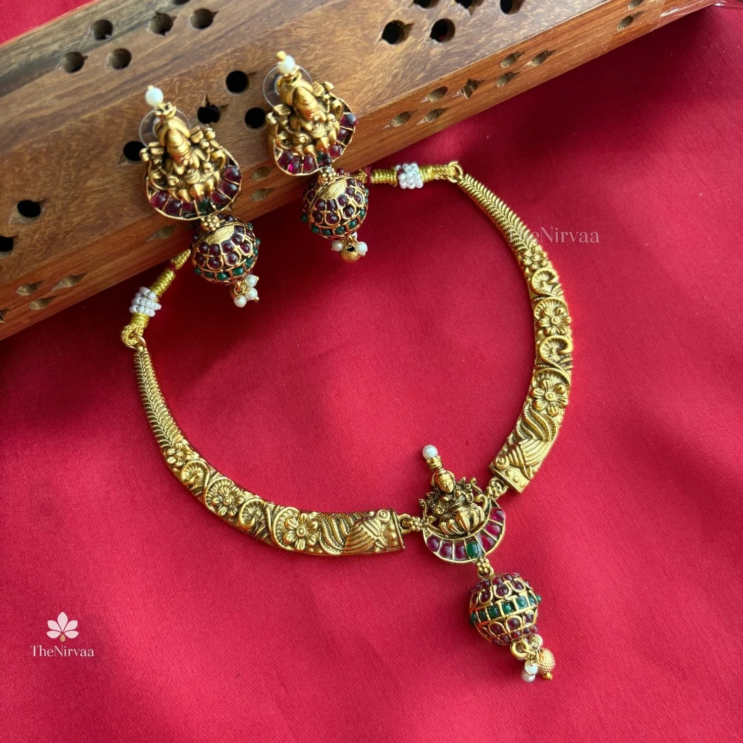 This gold‑toned jewelry set features a beautifully crafted necklace with a matching pair of earrings, showcasing intricate detailing, colored stones, and a rich traditional design. Its ornate patterns and vibrant accents give it a classic, elegant appeal perfect for festive or cultural occasions.