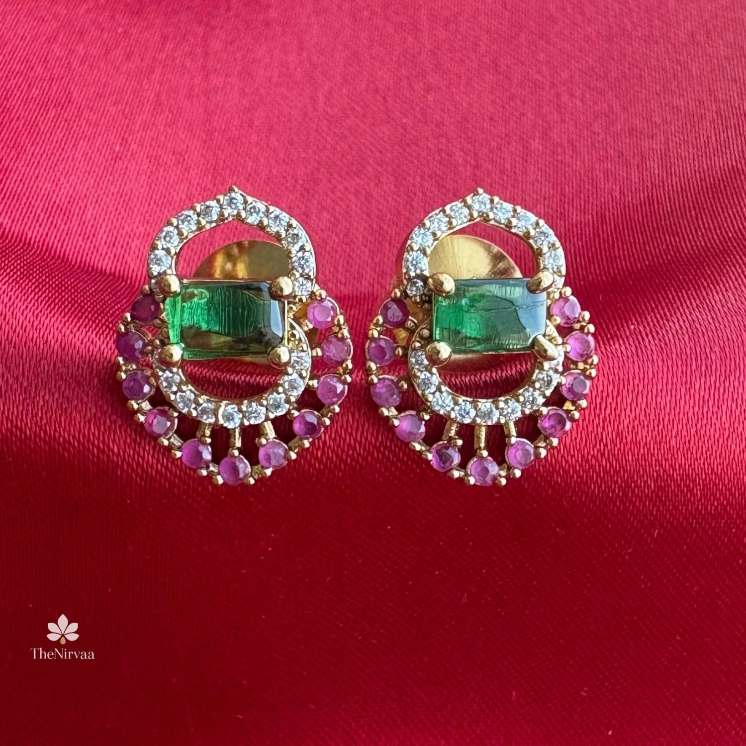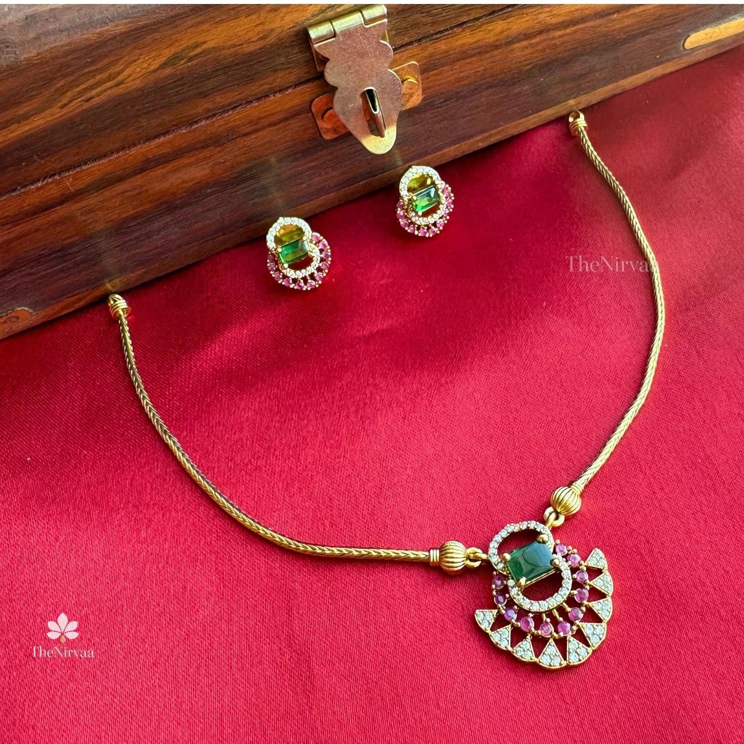 This jewelry set features a gold toned necklace with a matching pair of earrings, designed around a striking green central stone surrounded by red and white accents. The simple yet elegant arrangement gives it a classic, festive look that stands out beautifully against the rich background.