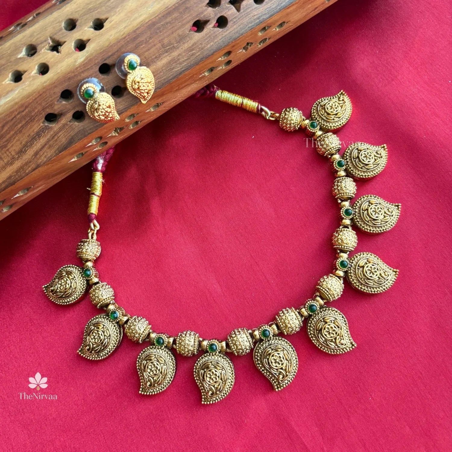 Traditional antique‑finish necklace adorned with engraved paisley charms and subtle bead accents.