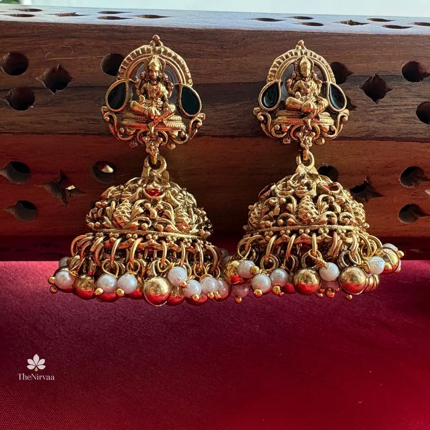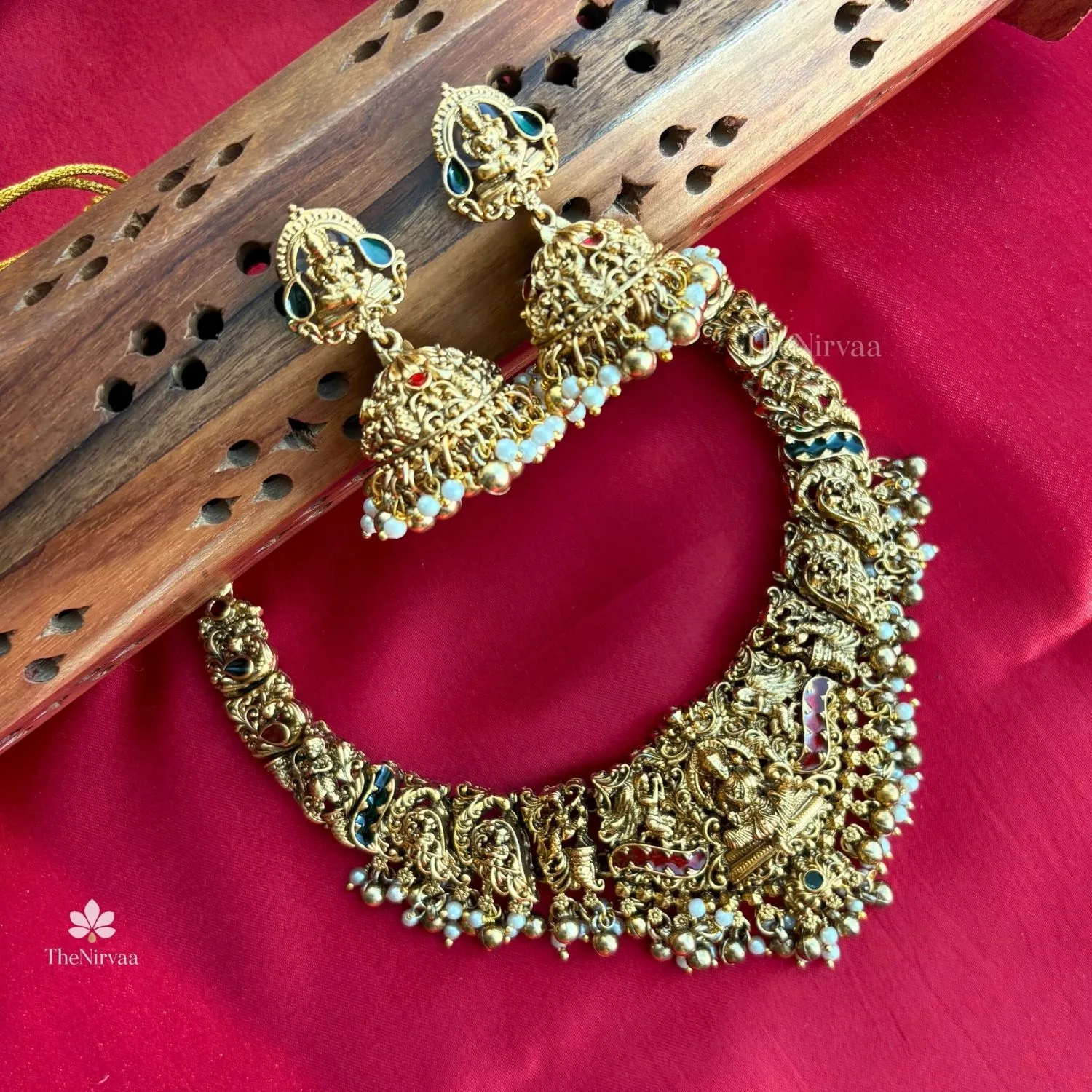 This set features a heavy traditional Indian gold necklace with matching earrings, showcasing intricate carvings, colored stones, and delicate pearl accents. The ornate motifs and detailed craftsmanship give it a rich, regal, and culturally classic look.
