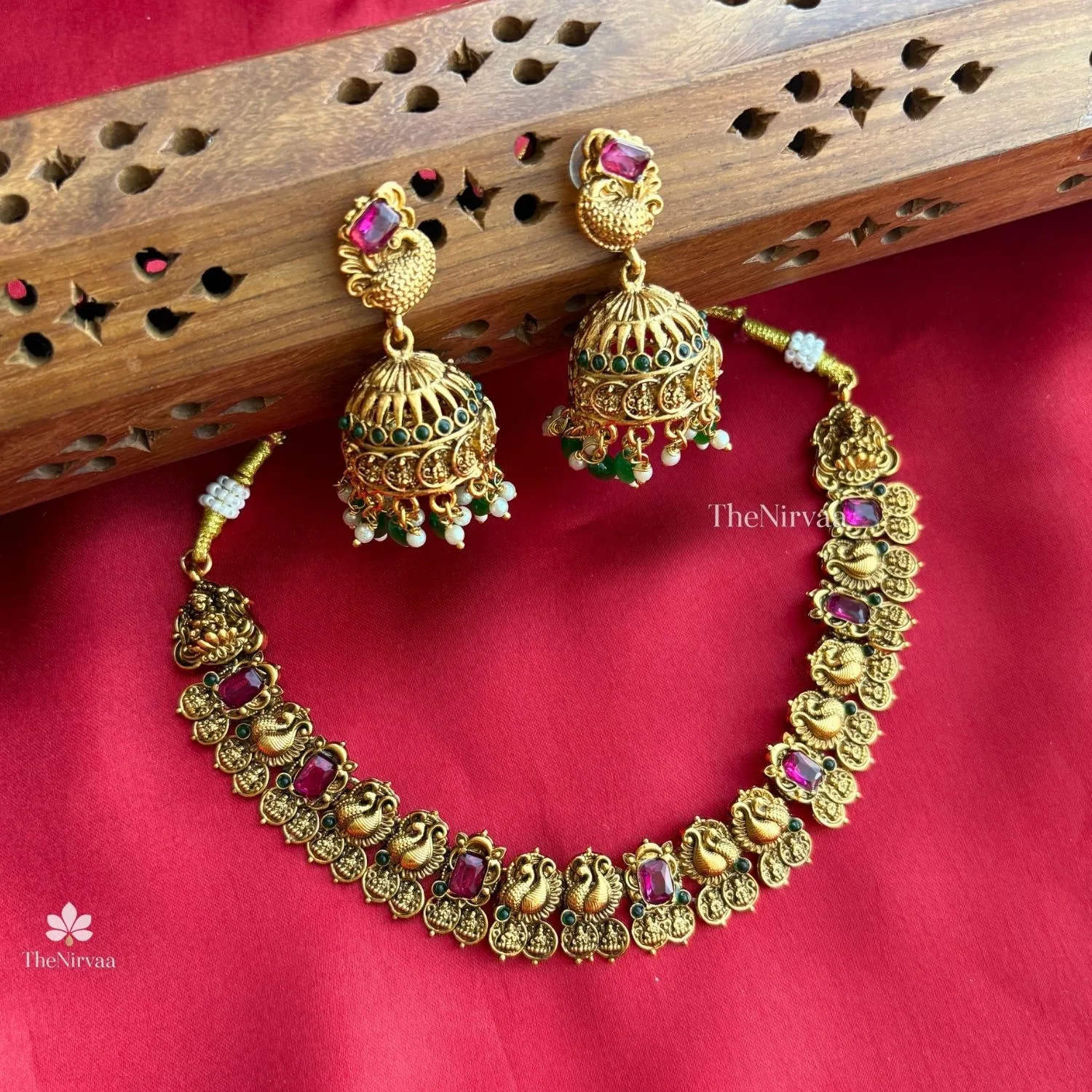 This gold‑toned jewelry set features a beautifully detailed necklace paired with matching jhumka‑style earrings. Intricate motifs, red and green stones, and delicate bead accents give it a rich, traditional look that feels both festive and elegant.