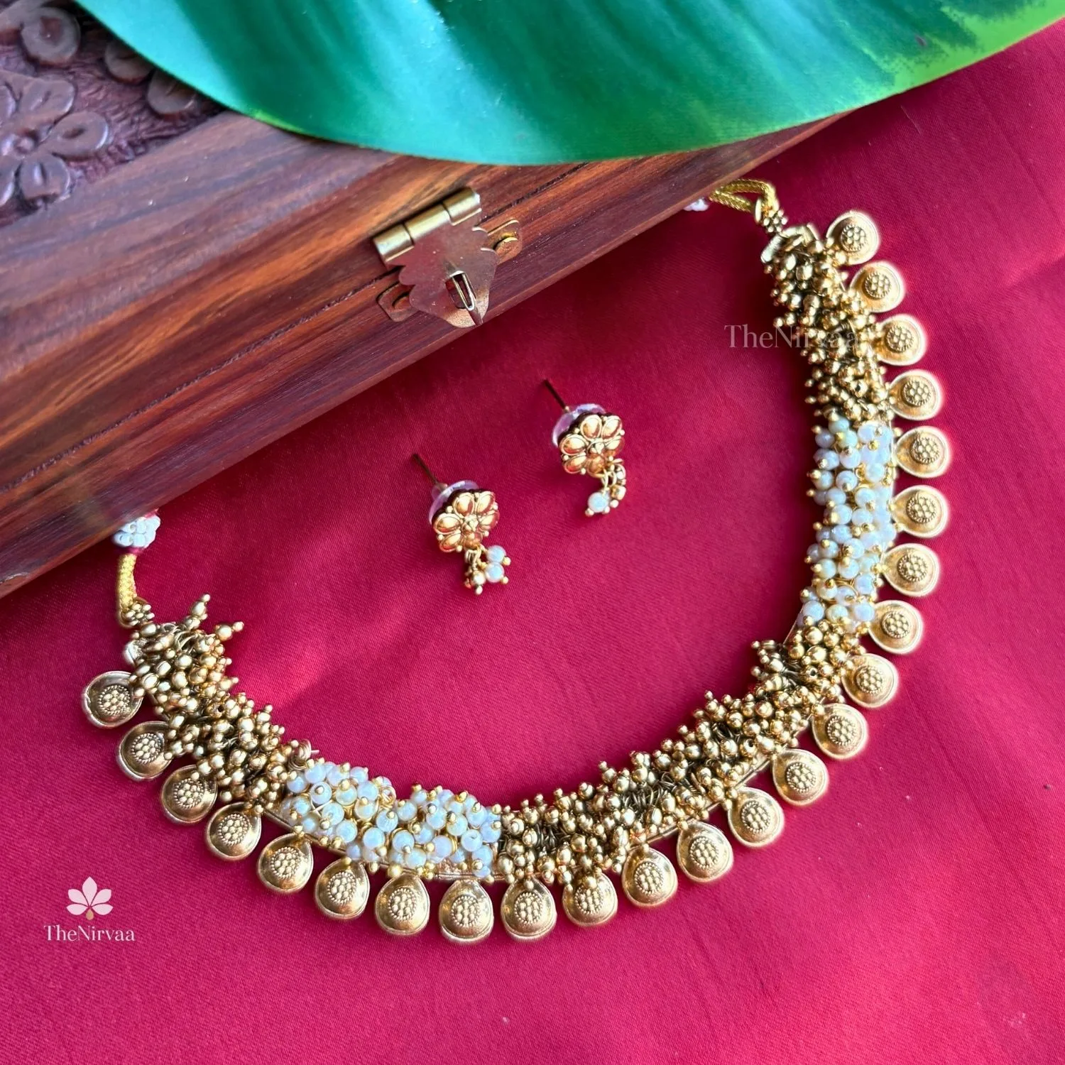 This set showcases a traditional Indian gold‑toned necklace with matching earrings, featuring intricate beadwork, white pearls, and ornate circular motifs. The rich detailing and classic design give it an elegant, timeless appeal.
